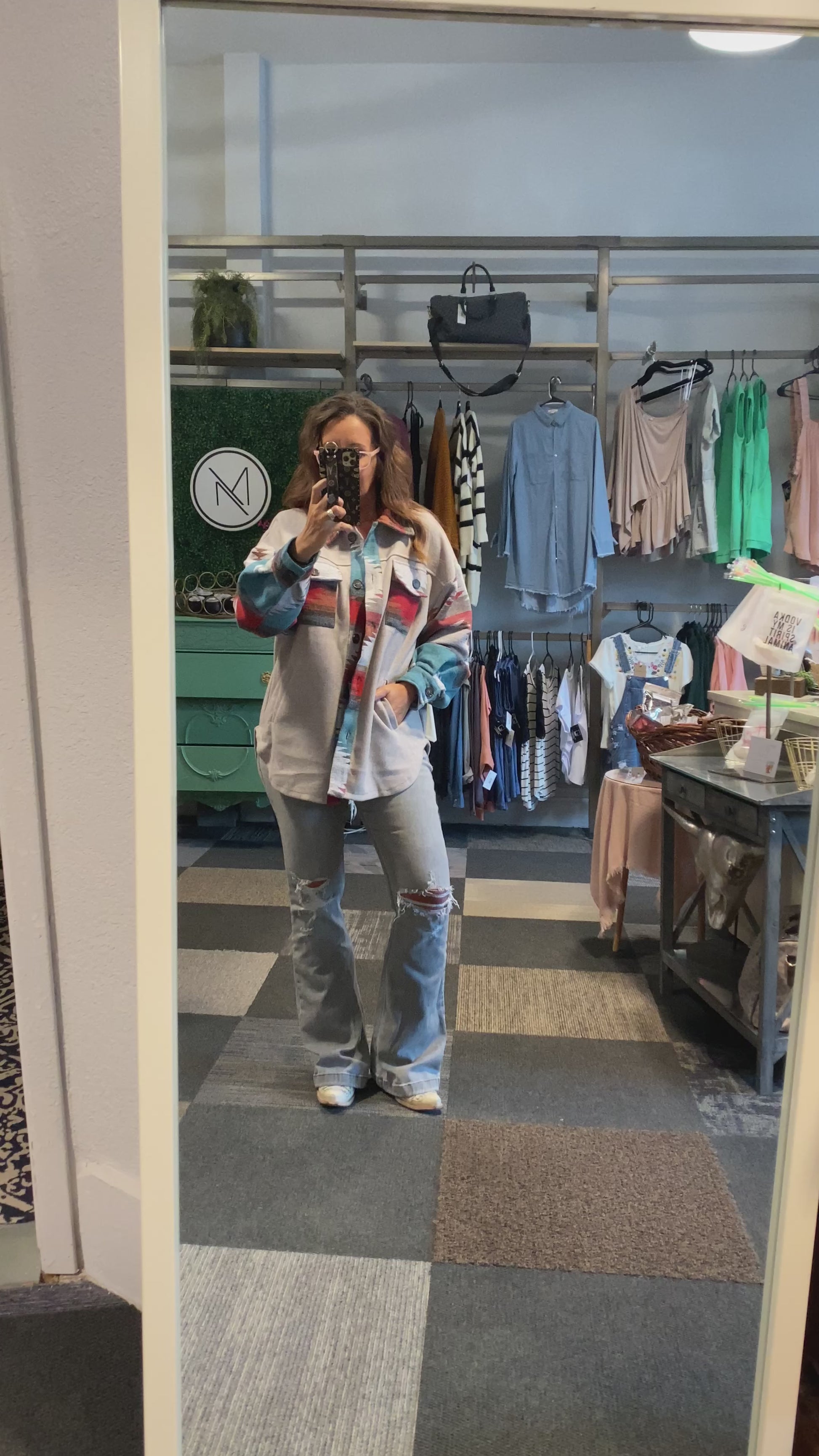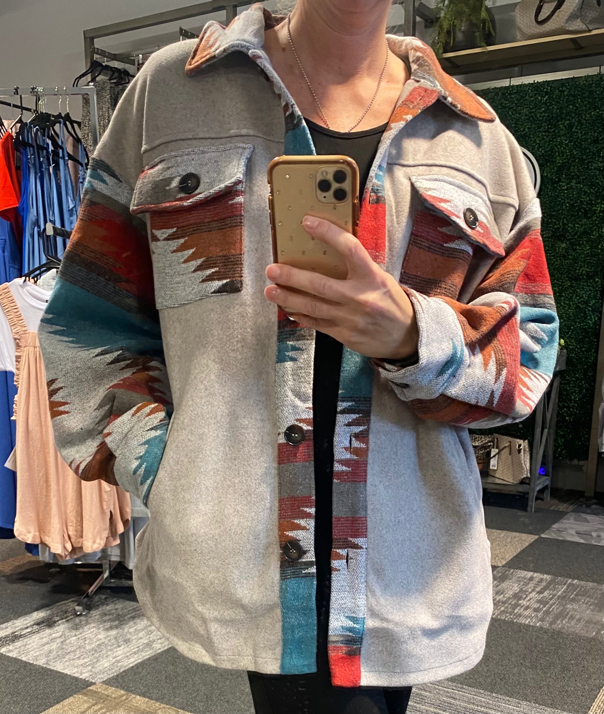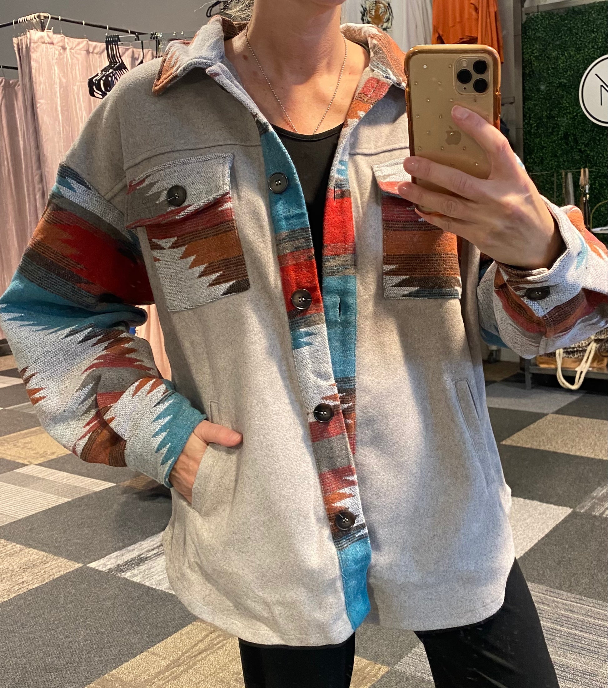 100% polyester shacket with Aztec print chest pockets. Oversized sizing. Model had the small on and had plenty of room to wear a sweatshirt or long sleeve shirt underneath.