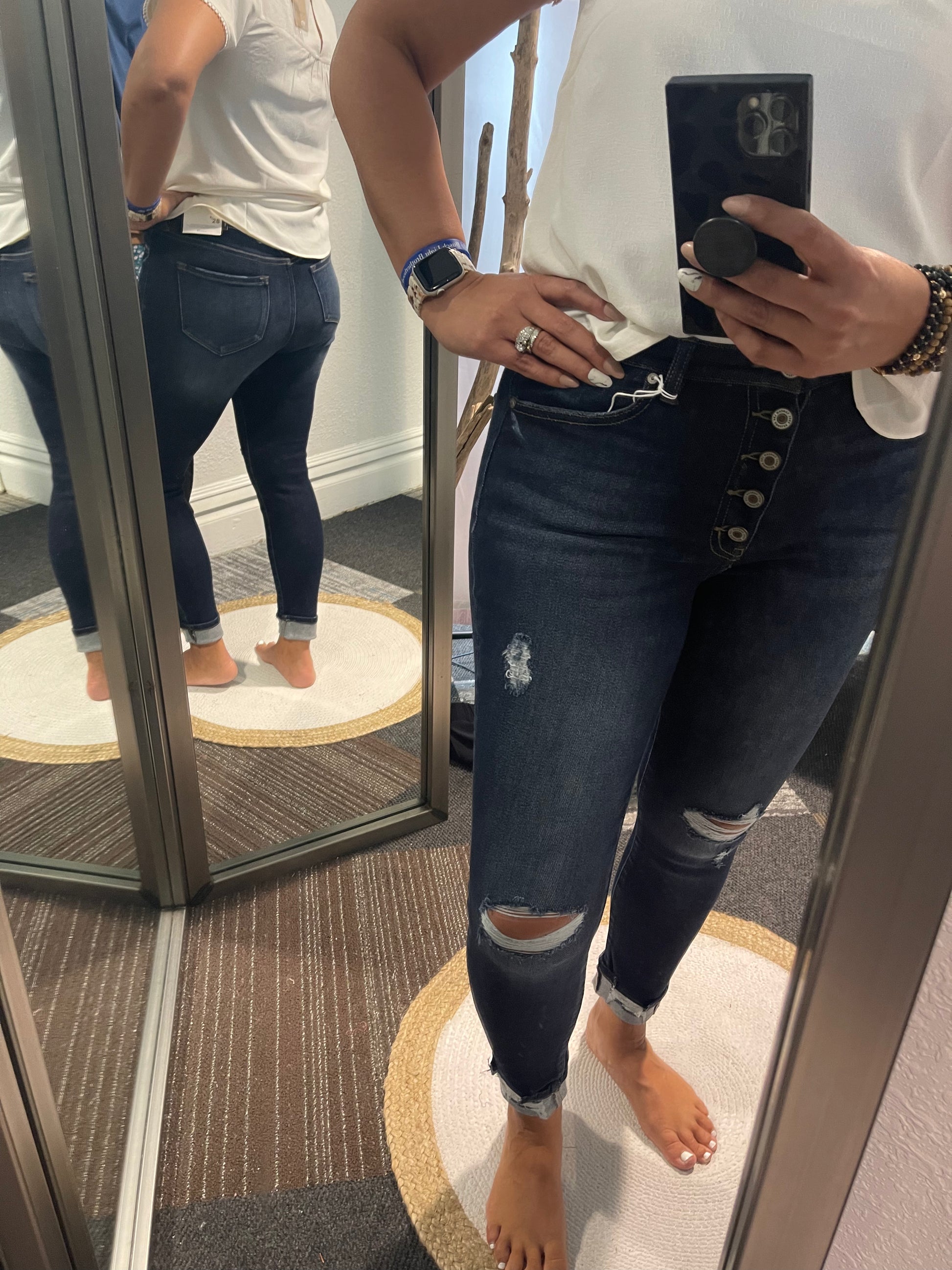 Cuffed ankle skinny and button down fly and a dark denim wash and distressed wear on knees.
