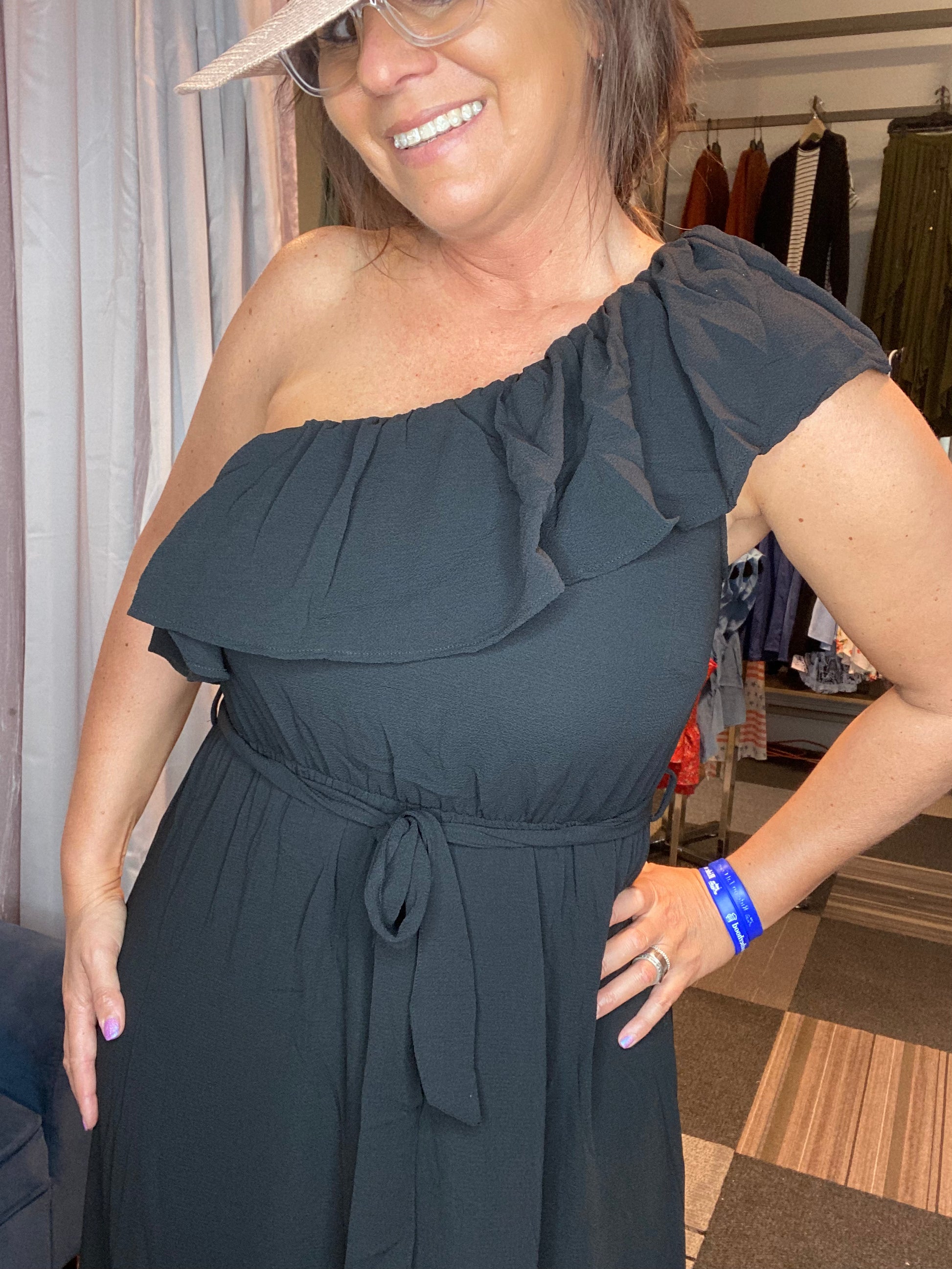 ONE SHOULDER RUFFLE WAIST ELASTIC TIE BELT MAXI DRESS