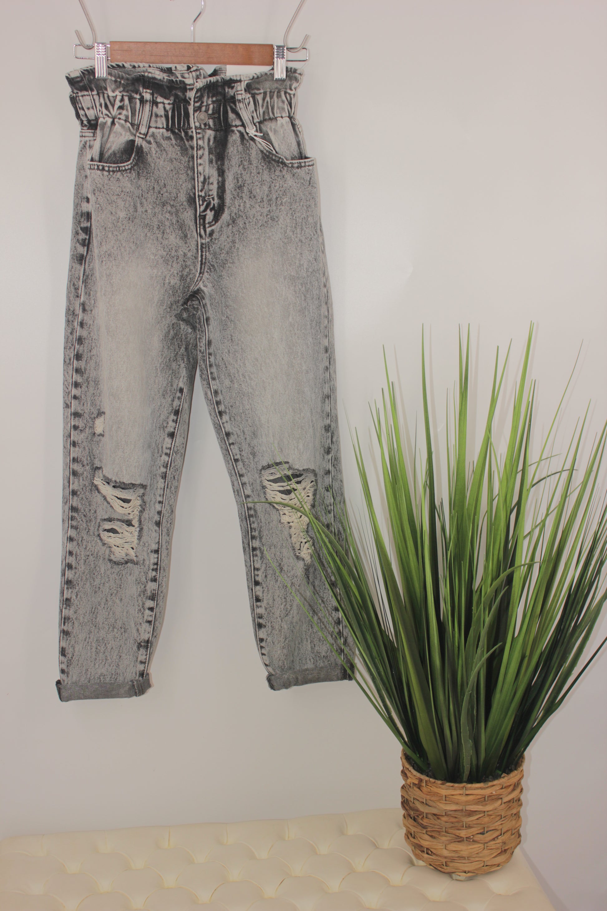 Light grey, high rise cuffed paper bag jean, stretchiness level #1