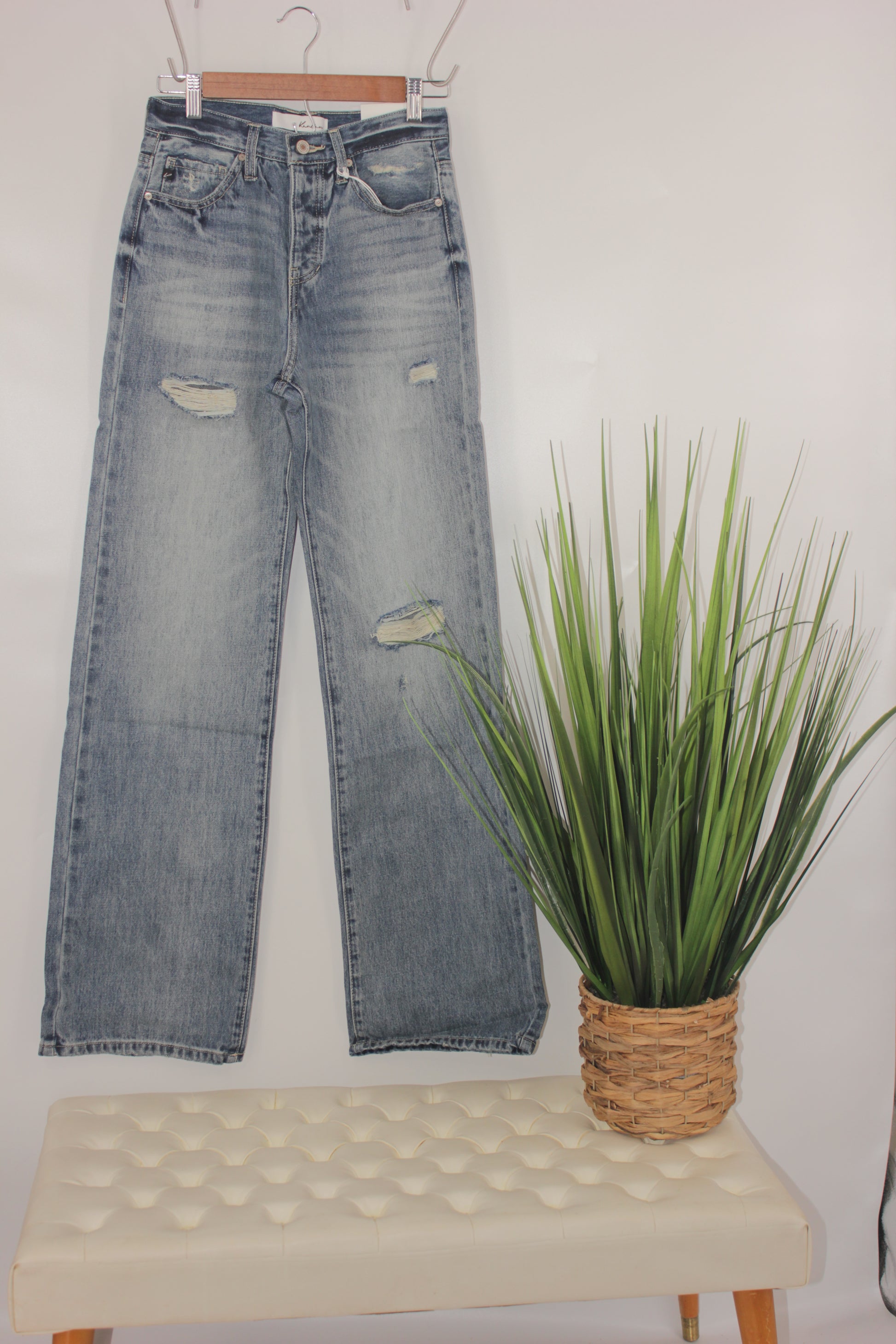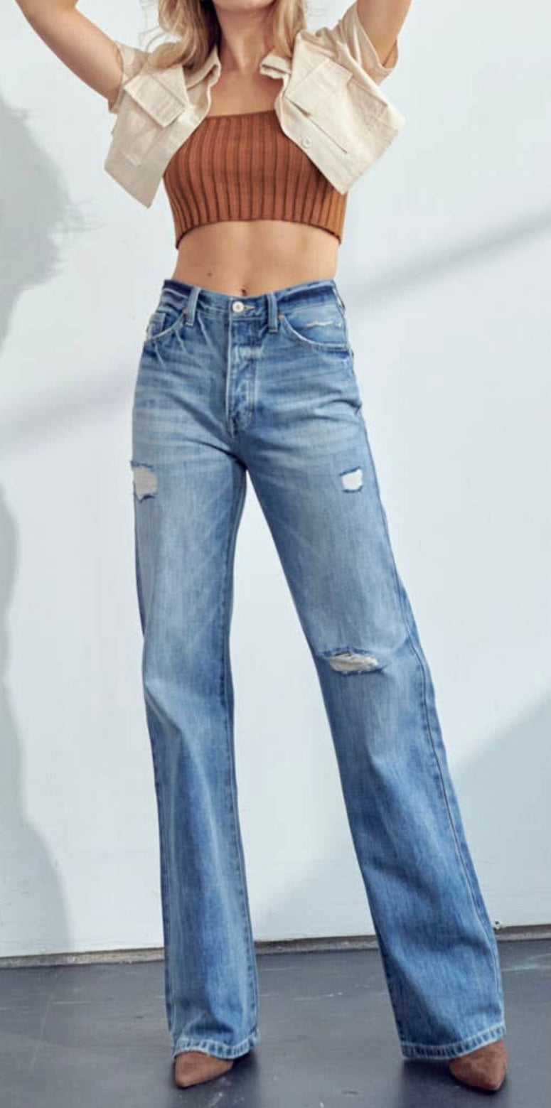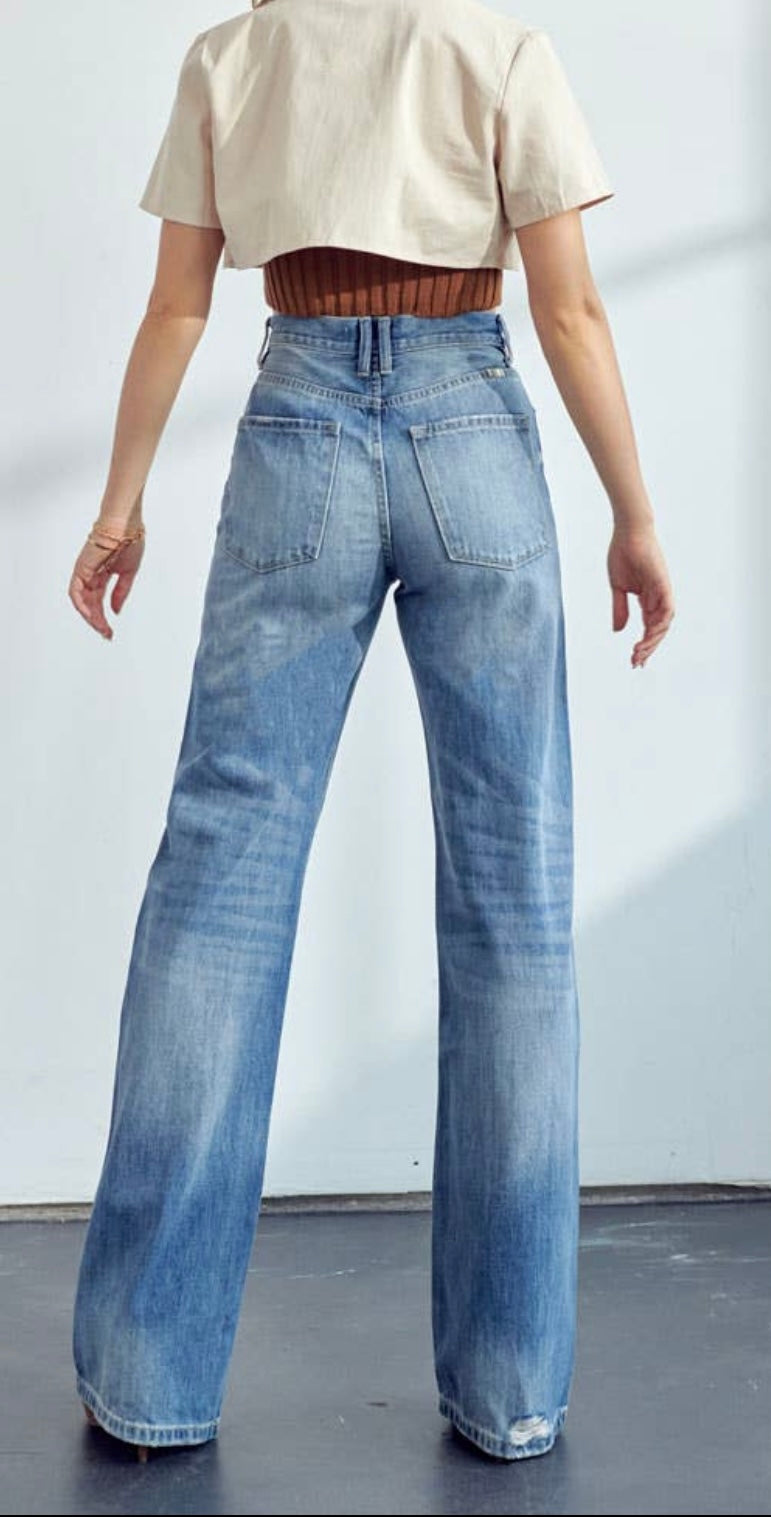 Medium faded wash with ultra high rise and flare minimal distress in front.